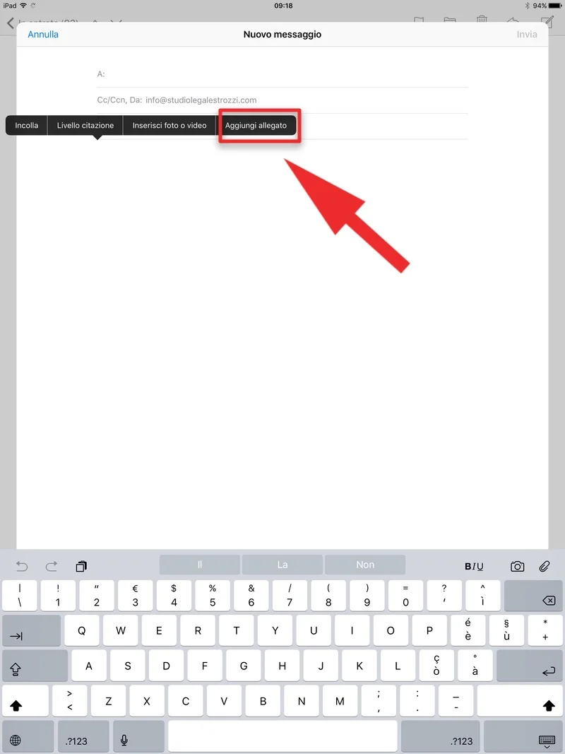 Per allegare un file in Mail.app occorre fare un doppio TAP all'interno del nuovo messaggio di posta elettronica. A questo punto comparirà il menù di scelta e dovremo scegliere "Aggiungi allegati", come si vede nell'immagine che segue.