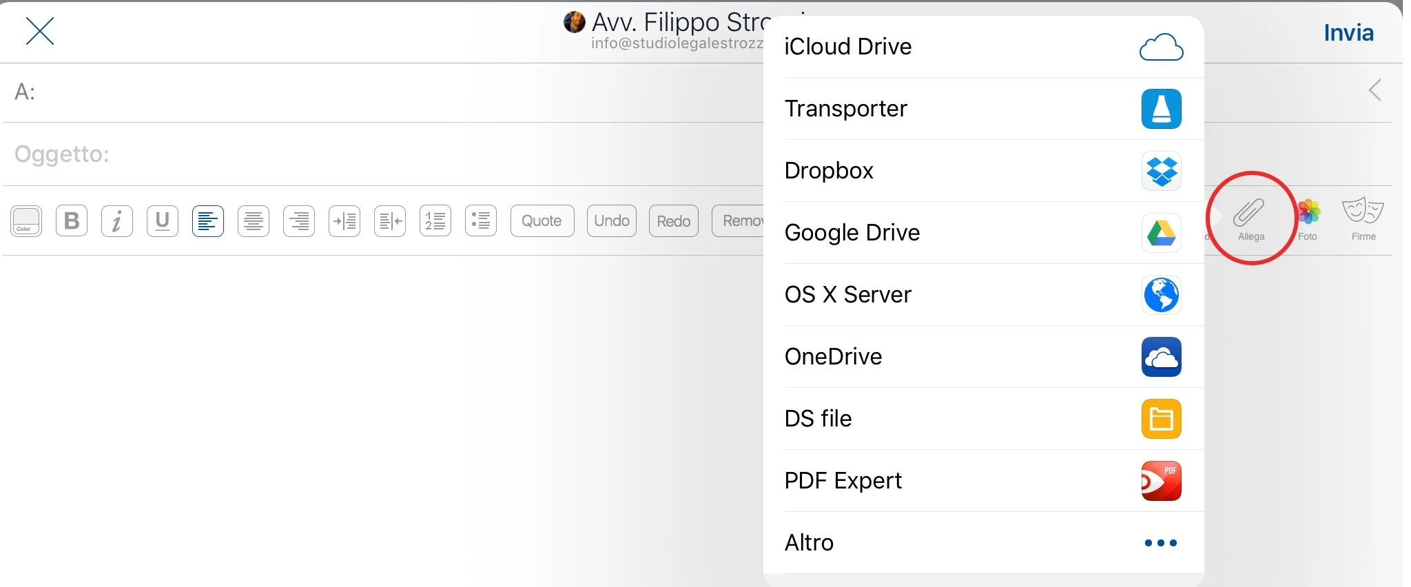 Ne approfitto per farvi vedere come è possibile farlo traverso Mail.app di Apple (la funzione è "nascosta") e AirMail dove il Document Picker è integrato nell'interfaccia dell'app (dimostrazione di un'applicazione ben sviluppata per supportare le funzioni avanzate di iOS).