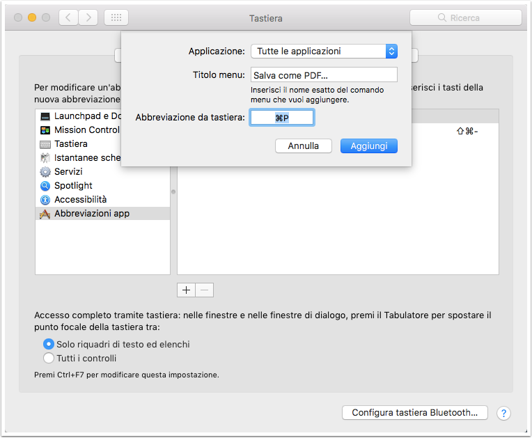 Fatto ciò possiamo impostare la nostra scorciatoia a tastiera. Portiamo il cursore all'interno del campo denominato “Abbreviazione da tastiera:” e, per i nostri scopi, digitiamo ⌘P.