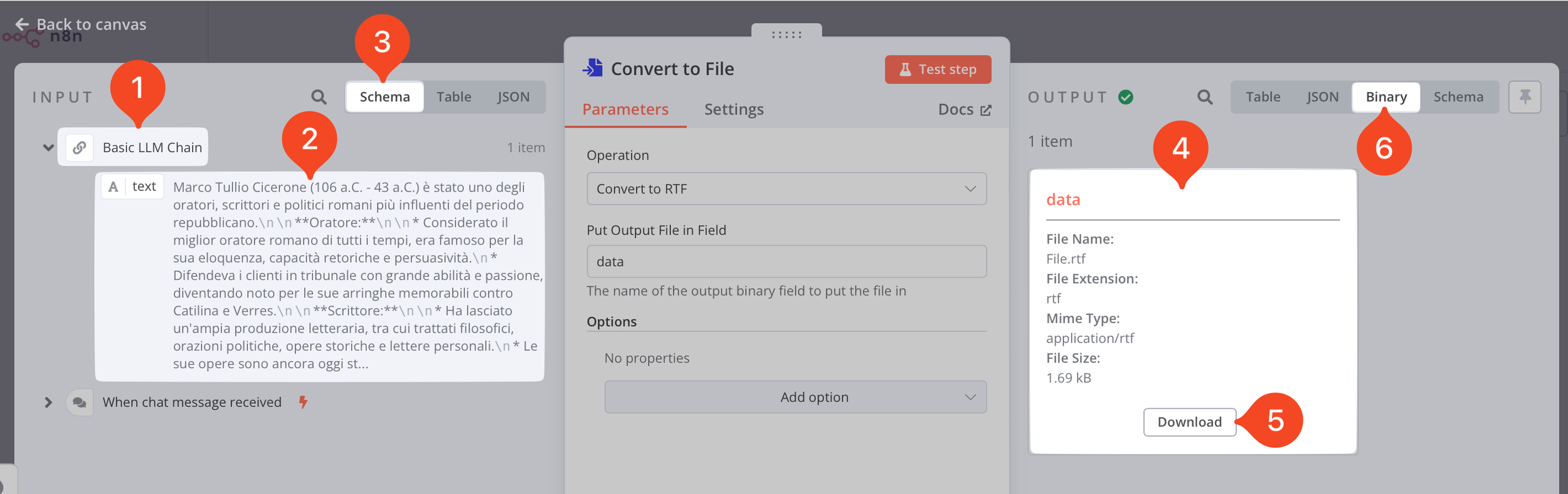 Sul lato destro, una volta premuto il tasto Test Step (ovvero Testa il passaggio), mostra quale oggetto la voce Data (punto 4) con la descrizione del file, la possibilità di scaricarlo (punto 5) premendo il tasto Download e verificare l’esatta creazione del file RTF, ed infine la voce Binary (punto 6), ovvero file binario.