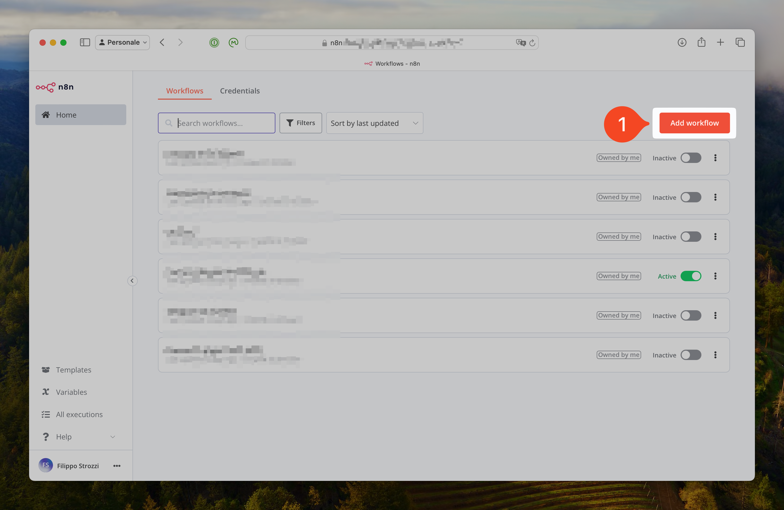 Interfaccia di n8n e pulsante per creare un nuovo workflow