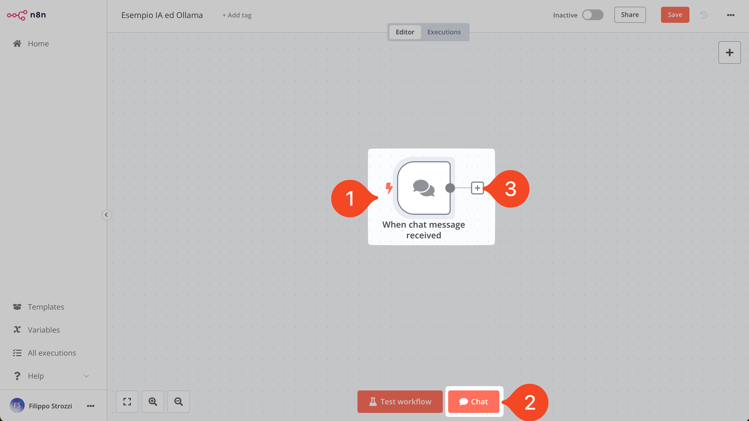 Infine, per continuare a creare il nostro flusso di lavoro, sarà sufficiente premere il tasto + alla destra del nodo chat (ed in generale di qualsiasi nodo in n8n) come mostrato nel punto 3.