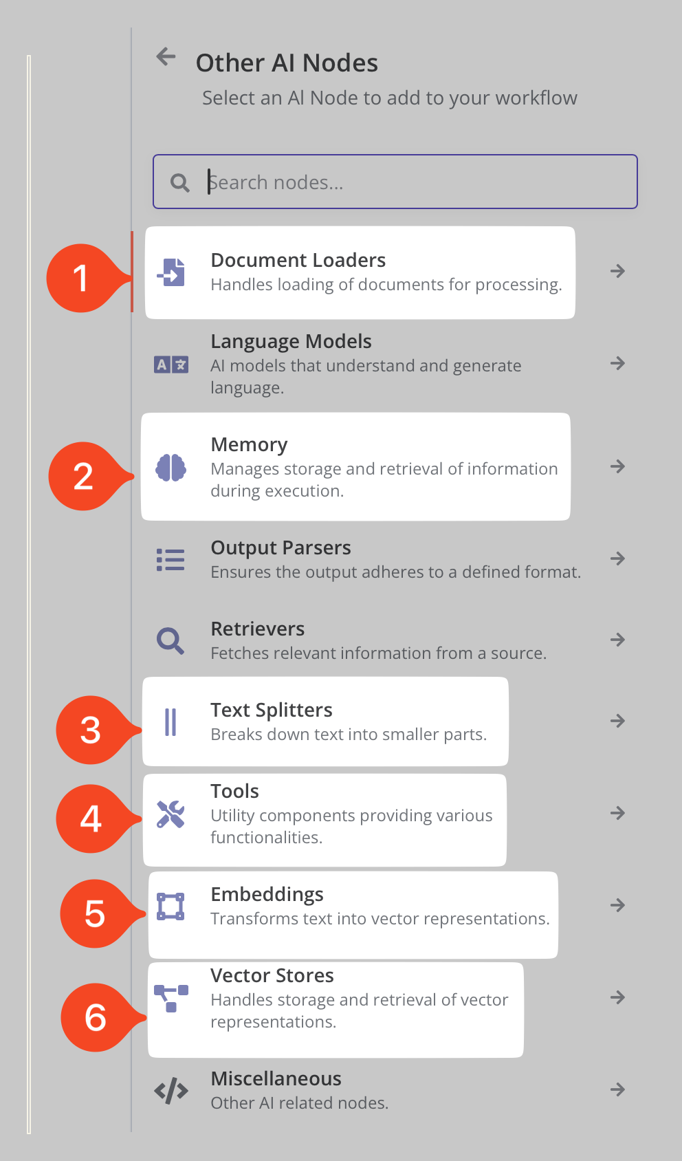- Other AI Nodes: traducibile in Altri nodi per l’IA che permette di accedere ad altre tipologie di nodi più specifici e complementare ai nodi “principali”.