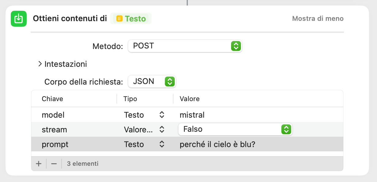 Possiamo quindi comporre la nostra richiesta alle API di Ollama.