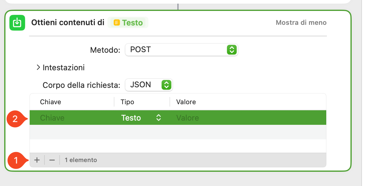Per fare questo dobbiamo inserire dei parametri all’interno della nostra richiesta POST. Per fare ciò clicca sul pulsante + come mostrato al punto 1 dell’immagine sottostante.