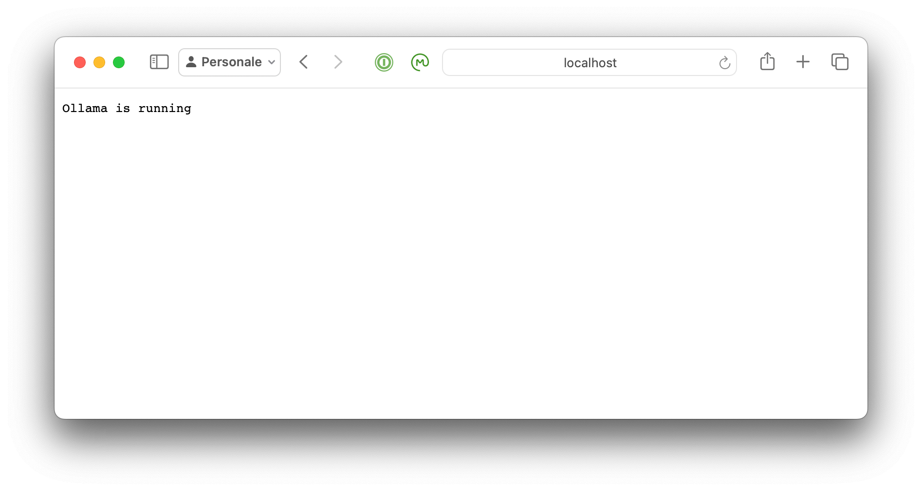 In estrema sintesi se hai installato Ollama sul tuo Mac aprendo un qualsiasi browser e digitando http://localhost:11434 vedrai una cosa simile all’immagine sottostante e ti dimostrerà che Ollama è operativo sul tuo Mac. Se te lo stai domandando :11434è la porta di rete attraverso la quale è possibile accedere ad Ollama.