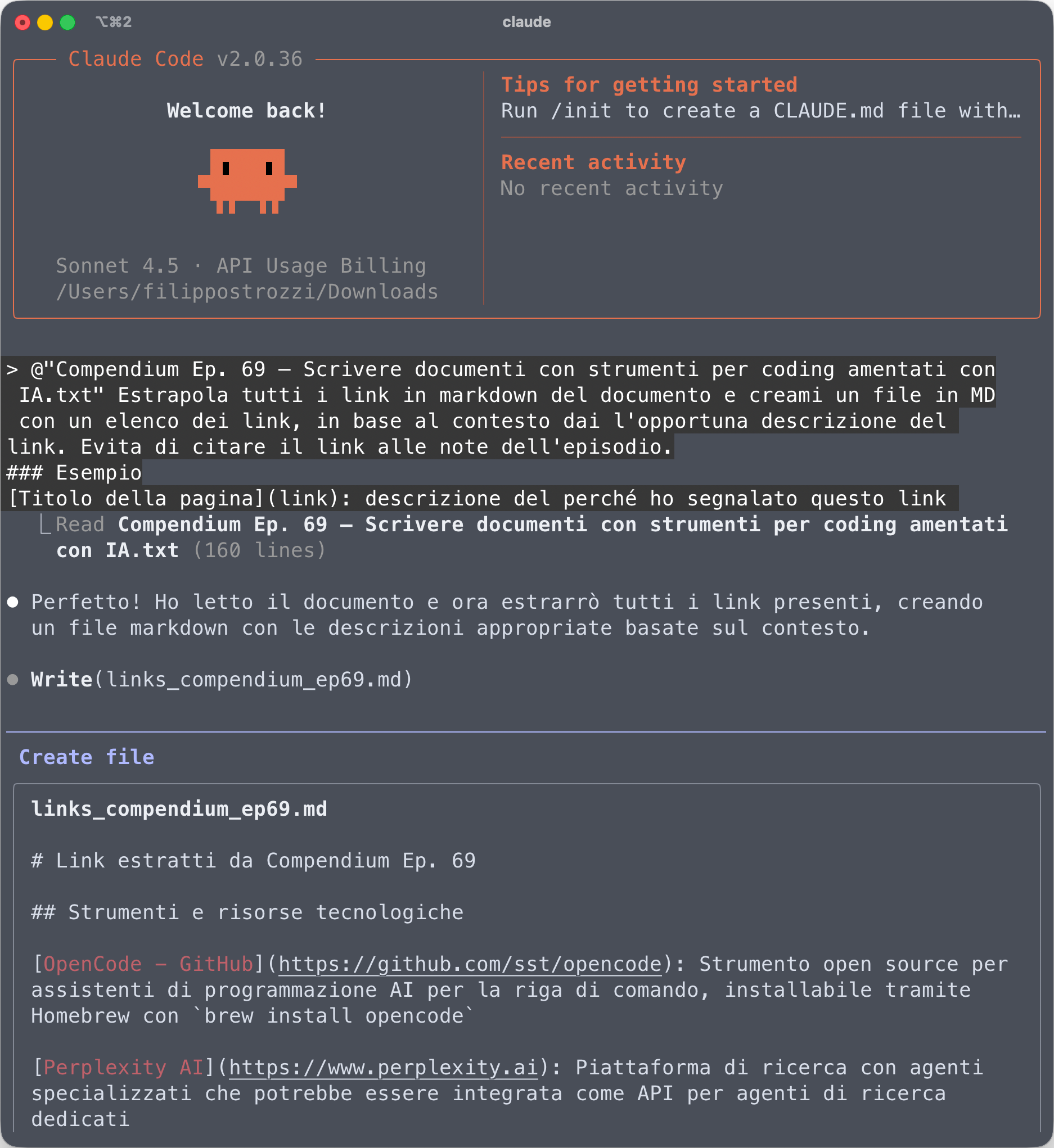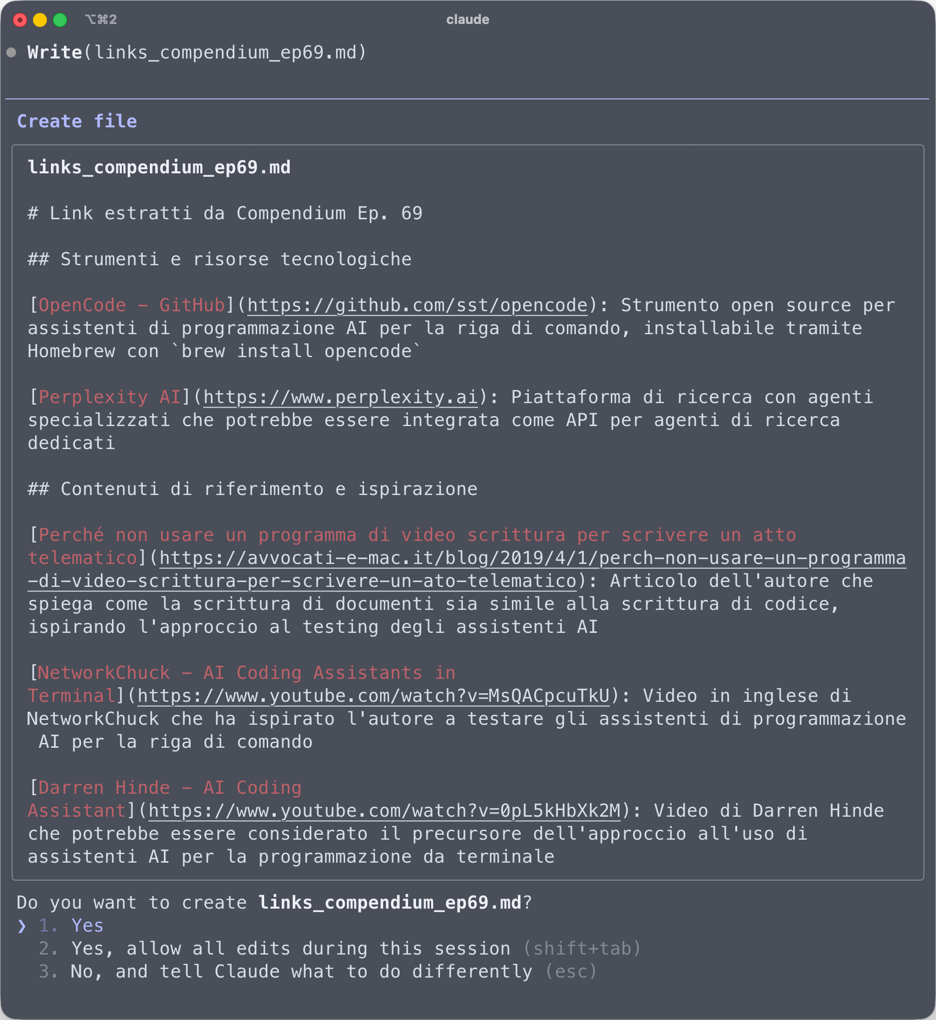 In questo caso specifico, ho chiesto a Claude Code di estrapolare dal file in Markdown creato da una mia mappa mentale di Compendium di estrapolare i link presenti ed organizzarli secondo un preciso schema.