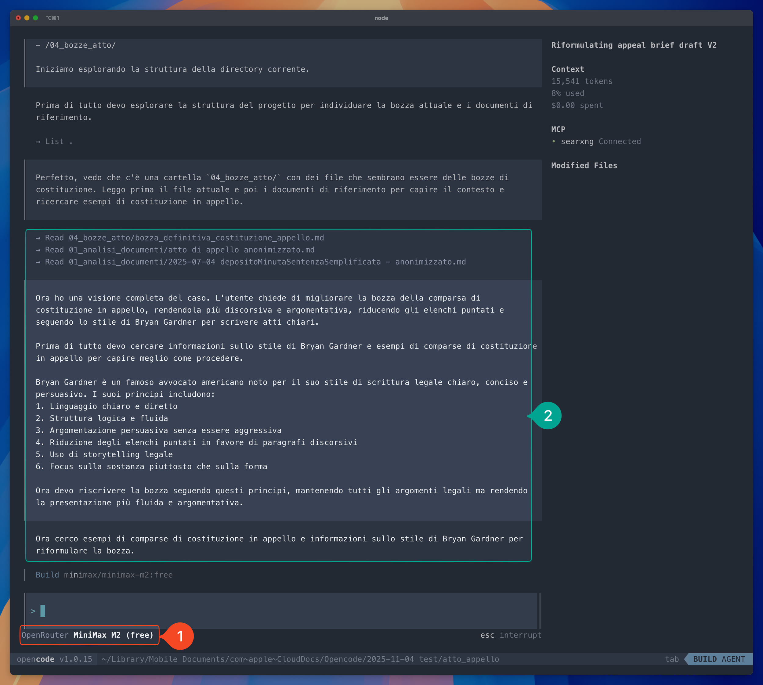 Ma MiniMax-M2 non si è fermato a questo. Nell’immagine sottostante è mostrato un passaggio della creazione di una comparsa di costituzione in appello (solo un test per ora) fatto sempre attraverso MiniMax-M2 e OpenCode (come mostrato al punto 1).