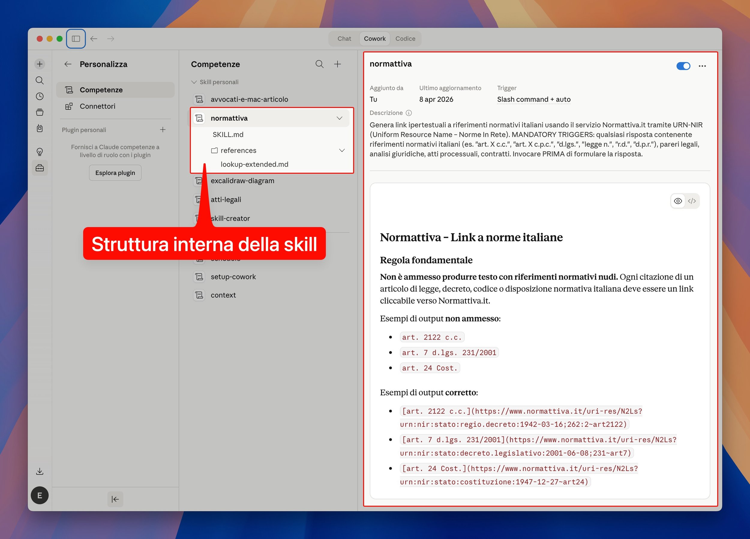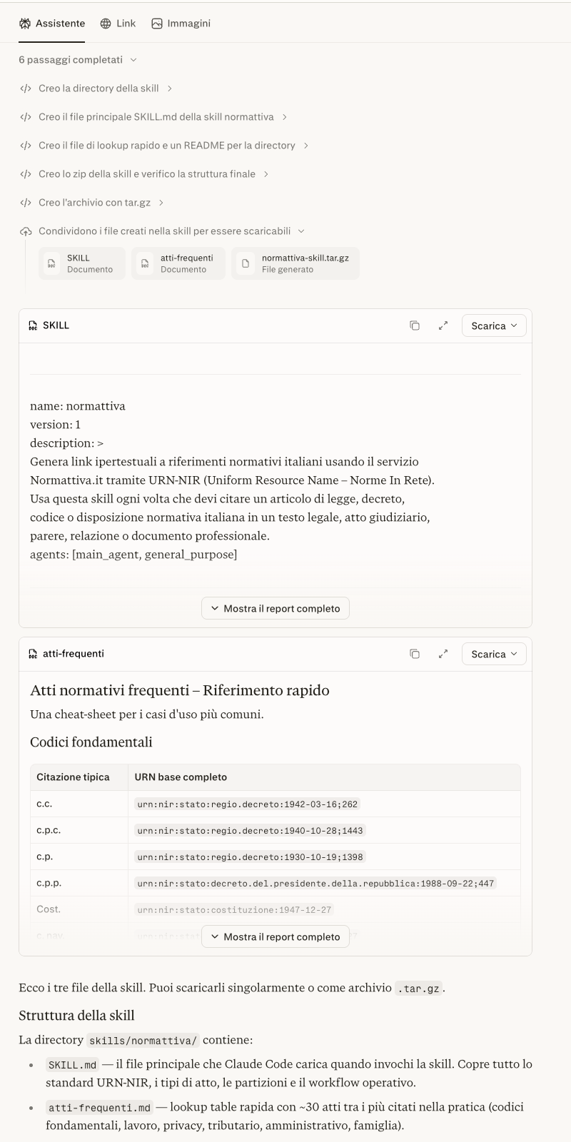 La skill che ho creato si chiama normattiva. Il suo compito è semplice: ogni volta che Claude produce un testo con riferimenti normativi italiani, genera automaticamente i link a Normattiva.it al posto delle citazioni nude.