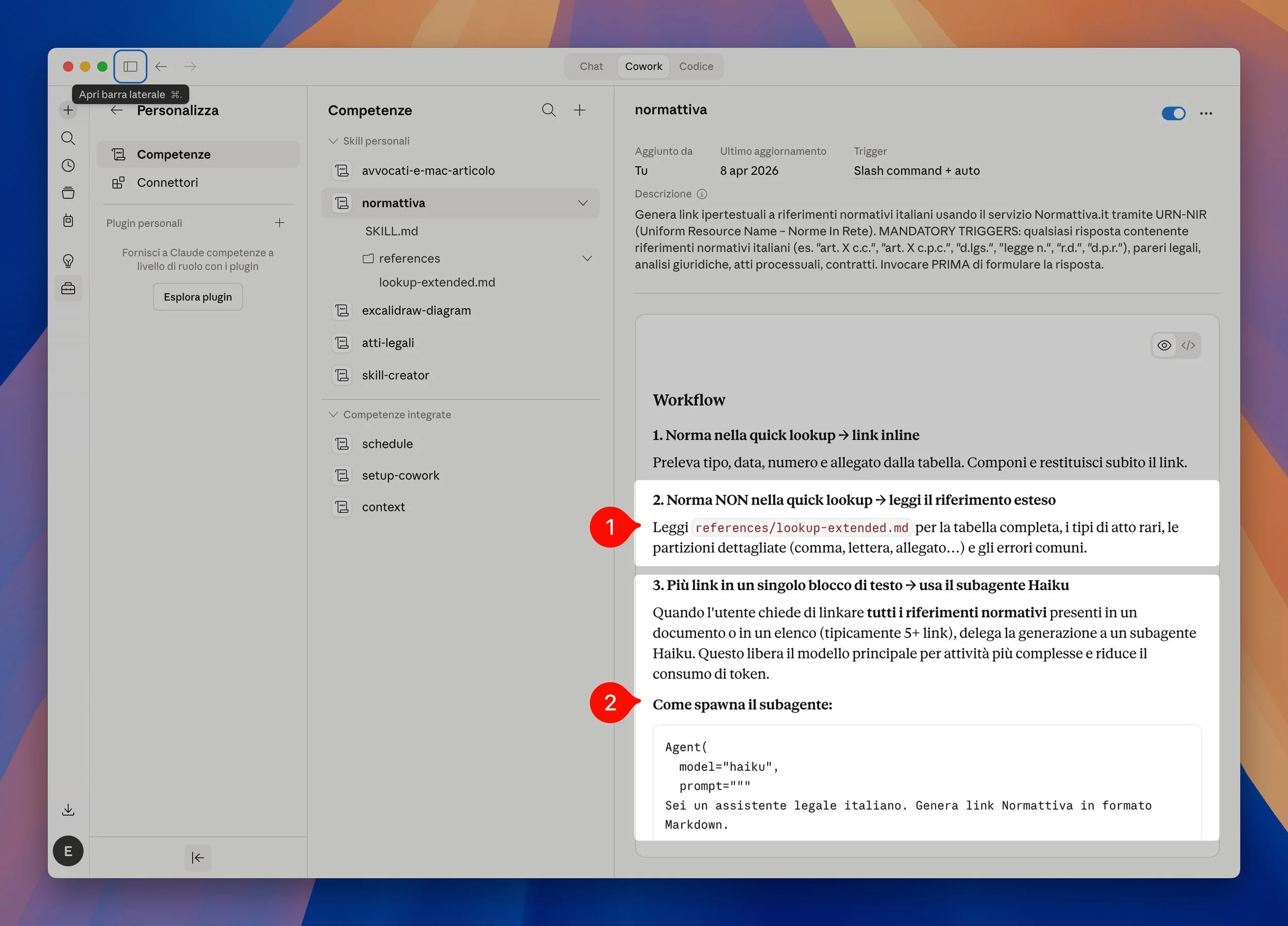 Infatti, per i documenti con molte citazioni normative: la skill prevede di delegare la generazione dei link a un subagente con il modello Haiku — più piccolo e veloce — invece di usare il modello principale. Il modello principale rimane libero per i ragionamenti complessi, questa skill infatti è utile a se stante ma molto di più in congiunzione con la generazione di documenti da parte dell’LLM.